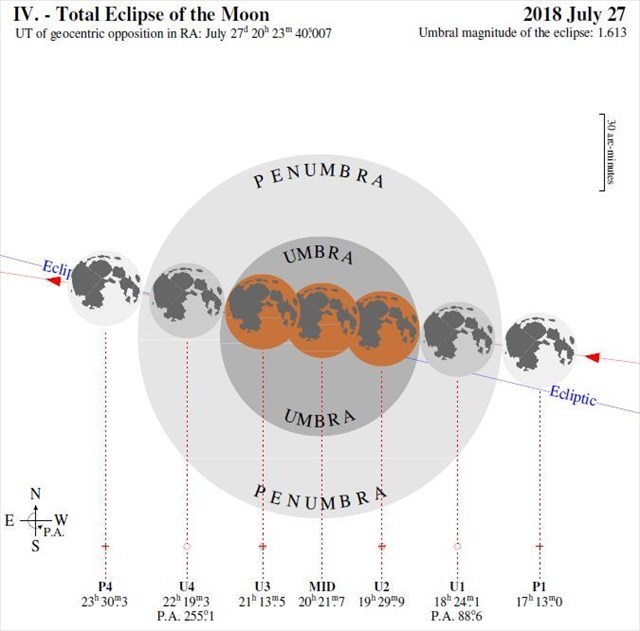 V Česku dôjde k tomuto úkazu na sklonku dňa, v piatok 27. júla 2018. Všetky fázy zatmenia budú trvať viac ako šesť hodín a to v čase od 19:14 hod. do 01:28 hod. nasledujúceho dňa SELČ. Počiatočná aj konečná fáza zatmenia bude však nevýrazná a voľným okom nepozorovateľná, v každom prípade pre astronómov zaujímavá.