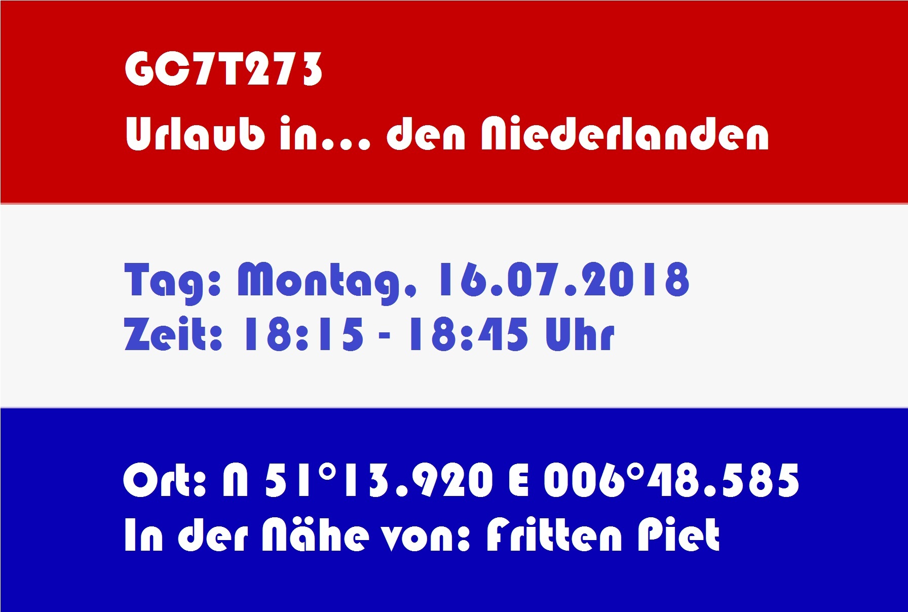Dieses Event steht im Zeichen von unseren westlichen Nachbarn: den Niederlanden. Also kommt vorbei und unterhaltet Euch über Stadt, Land, Leute und - natürlich - Caches (hierzu werde ich vor dem Event noch eine kleine statistische Auswertung erstellen). Natürlich können TB´s und Coin´s getauscht warden.