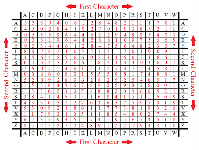 Once you have the 2 characters then you will need to look at the second table (at the bottom of the 10 questions) which cross-references the 2 letters of the alphabet. For the first character you need to look along the horizontal, and for the second character you need to look up and down the vertical. For example, California is represented by CA, so you would look along to the 'C' column, then move up that column to the 'A' row. The answer for that state would therefore be the character which is in that box (in this example CA = 3).