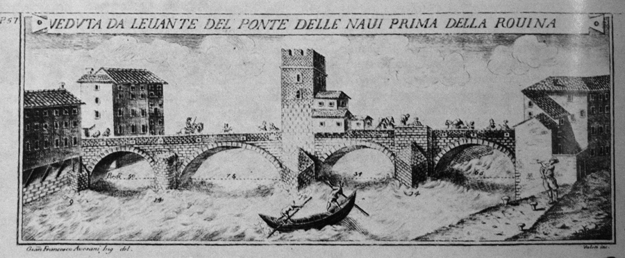 " Nella torre ormai isolata e pericolante fra i vortici erano rimaste due donne e due fanciulli. Benché si facessero offerte di denaro, nessuno osava esporsi al pericolo, anche per la quasi impossibilità di appoggiare scale. Giunto a caso, Bartolomeo Rubele, detto il Leone della Valpantena, si offrì; unì con corde le scale, gettò spago e funi nella torre, perché le donne aiutassero a tirare e poi assicurassero la scala: ottenuta da un sacerdote l'assoluzione, sale intrepido, benché le scale pieghino per rilassamento delle corde: giunge alla torre, benda gli occhi alle donne e legatele sui fianchi, tiene stretta la fune e le fa scendere ad una ad una. Poi mette i singoli fanciulli in doppio sacco e li cala con le corde tenute all' altro capo da qualcuno verso San Paolo. Scende salvo, ricusa il premio offertogli dal conte Spolverini e sfolla applaudito. Verona riconoscente gl'intitolò il Lungadige destro dal ponte Navi al Nuovo, dirimpetto a quello del re Teodorico.