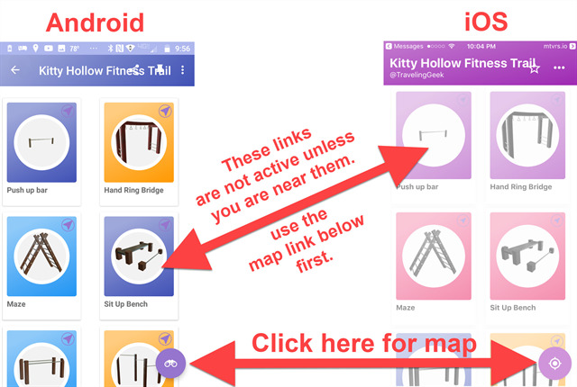 The Kitty Hollow fitness trail includes two (overlapping) walking trails and eight exercise stations. And now it includes six Augmented Reality Geocaches!