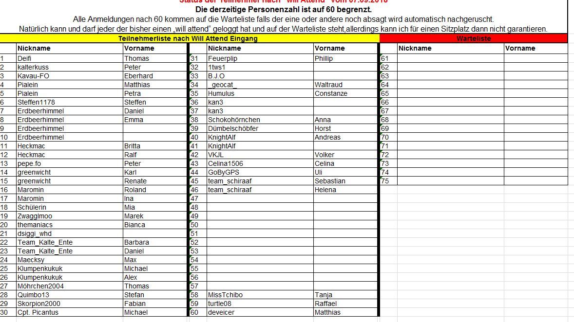 Ich würde dann in der Eventteilnehmerliste sowohl Cacher wir auch Vornamen aufnehmen und unter dem Event veröffentlichen. Ich würde mich freuen, wenn der Vorschlag bei euch ebenfalls auf Anklang finden würde.