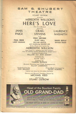 Here's Love was directed by Stuart Ostrow and choreographed by Michael Kidd. It opened on October 3, 1963 at the Shubert Theatre, and closed on July 25, 1964 after 334 performances and 2 reviews. The cast included Laurence Naismith, Janis Paige, Craig Stevens, Lisa Kirk, Fred Gwynne, Kathy Cody, Michael Bennett, and Baayork Lee.