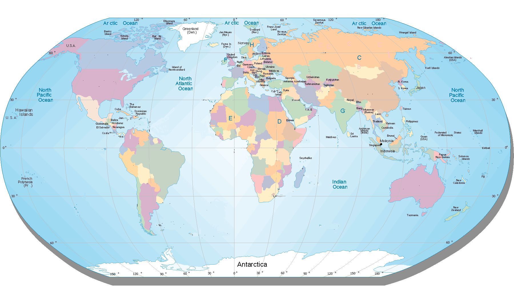Här har vi en världskarta. Tio länder har en bokstav A-J. Jag vill veta antalet bokstäver i landets svenska namn. Jag vill veta det som dom det vanligen går under. Kina tex kallas ju kort och gott Kina, men heter officiellt folkrepubliken Kina. Du säger ju inte att du ska åka till folkrepubliken Kina på cachingsemester, du säger bara att du ska åka till Kina
