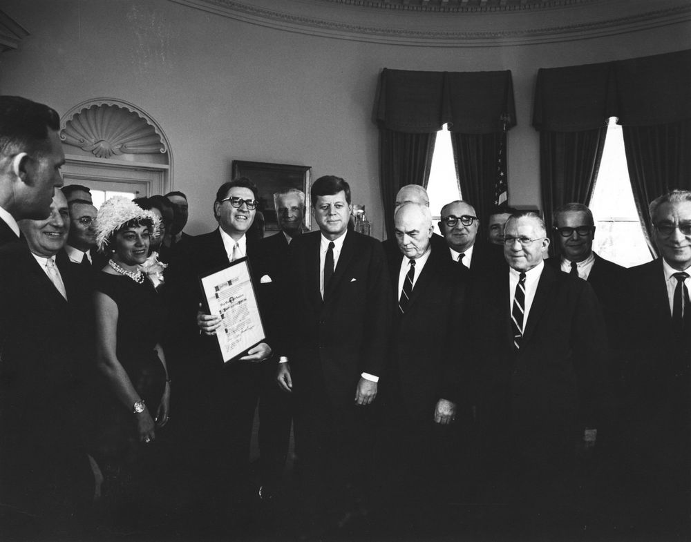 President John F. Kennedy (center) stands with composer Meredith Willson (holding award) and others after presenting Mr. Willson with the Big Brother of the Year award. Actress and singer Ralina "Rini" Willson, wife of Meredith Willson, stands left of her husband; U.S. District Court Judge Luther Youngdahl (back left) and Charles G. Berwind, President of Big Brothers of America (right), stand on either side of President Kennedy; Saul Caston, conductor of the Denver Symphony Orchestra, stands at far right. All others are unidentified. Oval Office, White House, Washington, D.C.
