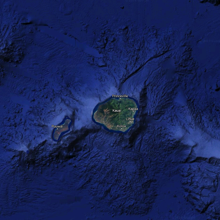Take an overhead view of Kaua'i, courtesy of satellite imagery from Google, and you can appreciate the fact that the island is actually an enormous, mostly-submerged mountain. Even when you stand at these coordinates, at sea level, you are actually near the top of this mountain! The highest point on Kaua'i is Kawaikini at 5,243 feet in elevation. Combine that with nearby ocean depths northeast of Maui that are as deep as 18,860 feet, and we can estimate the "mountain" of Kaua'i to be as tall as 24,103 feet. That's only #78 on the list of world's tallest mountains, but it's a lot taller than any above-water mountain in the United States!