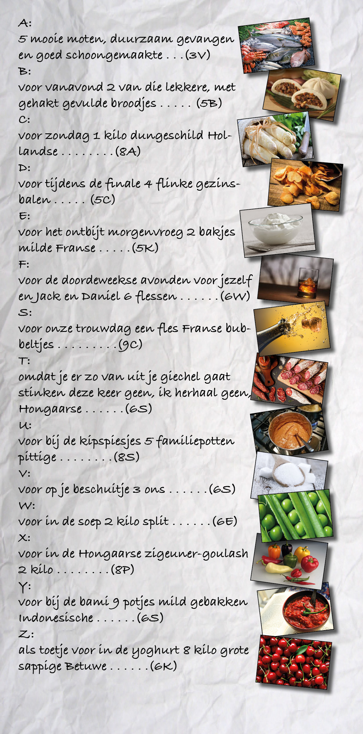 “Hoe kun je nu zo stom zijn, en er al weer in trappen?” zo vroeg Herr Vectra zich vertwijfeld af toen hij in de plaatselijke buurtsupert stond met onderstaand lijstje in zijn handen. Een ezel stoot zich in het gemeen maar vier keer aan dezelfde steen, maar Herr Vectra krijgt het dus voor elkaar om er voor de zoveelste keer met vier benen tegelijk in te trappen en op pad te gaan met zo’n #@!><$% boodschappenlijstje van Frau Vectra. En Frau Vectra geniet er volop van, als een vis in het water. Niet van het plagen hoor, maar van het maken van die “leuke” lijstjes.