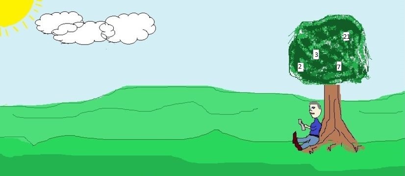 The guy sitting under the tree is not Marc Anthony, preparing his salutation to Julius Ceaser, nor is he Newton and those aren't apples. In fact, he is a serious mathematician, busy with something else.