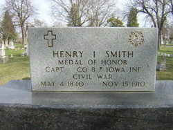 Henry Smith was a civil War Congressional Medal of Honor Recipient. He served as a First Lieutenant, in Company B, 7th Iowa Infantry. At Black River, North Carolina, on March 15, 1865, his company attempted to construct a pontoon bridge over a portion of the flooded river that was held by Confederate troops. In the midst of the struggle with the rebel defenders, one of his soldiers was swept away in the current. First Lieutenant Smith, threw off his coat and sword and swam to the soldier's rescue, bringing him to shore to continue their mission. For valor in the face of the enemy, he was promoted Captain and awarded the Medal of Honor.