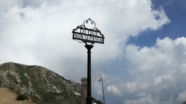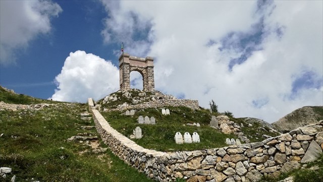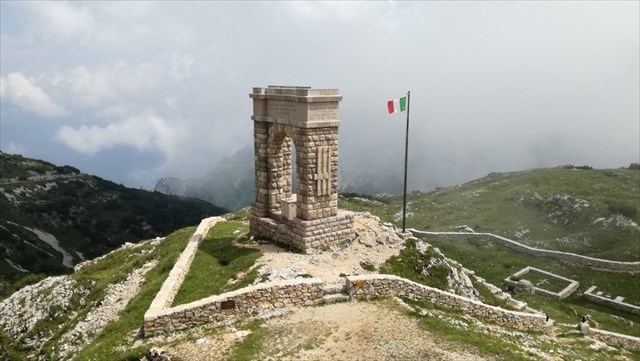 The Italian cemetery "Di qui non si passa" stood on a summit at 2035 m just off the road that connected the "Porta del Pasubio" with the Command saddle of 2081. It was one of the great cemeteries that had sprung up on the summit of Mount Pasubio, close to the front of the fighting. It was built by the infantrymen of the Liguria Brigade in 1916, under the command of General Achille Papa.