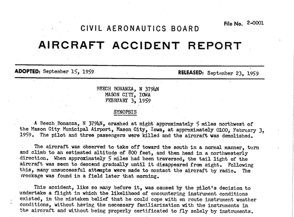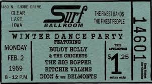 It was on this day that rock and roll musicians Buddy Holly, Ritchie Valens, and J.P. "The Big Bopper" Richardson along with the pilot, Roger Peterson died in an airplane crash soon after takeoff, late at night and in poor, wintry weather condidtions.
