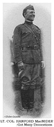 Capt. MacNider was wounded in action Sept. 12, 1918, in the St. Mihiel offensive. He was promoted to major Oct. 17, 1918. On Dec. 27, 1918, he was assigned as division adjutant of the 2nd Division, and was stationed with that unit in Germany until July, 1919, being promoted to lieutenant-colonel May 9 of that year.