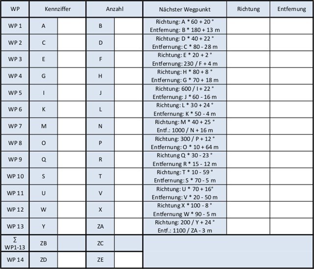 Die einzelnen Aufgaben sind in der Wegpunktliste aufgeführt. Den jeweils nächsten Wegpunkt findet Ihr mit Hilfe der Peilformeln. Den Multi habe ich mittlerweile auf Koordinaten umgestellt, am Rechner finde ich das Peilen (mit flopp.net oder einer anderen Anwendung Eures Vertrauens) angenehmer. Seht Ihr das anders, dann nehmt die Wegpunktliste des Multis.