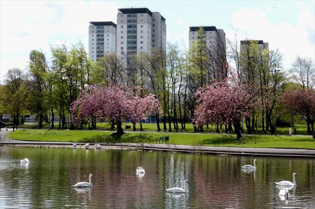 The park contains a lake, model boat club, children's playground, bowling green, tennis court, running track, pitch-and-put course, grasslands and a small stream - Garscadden Burn. The area of green land just south of the park contains an outdoors gym, multi-games court and the new Glasgow BMX Centre, built for the 2018 European Championships.