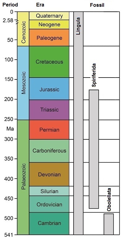 Examples of Brachiopod fossils can be found in the graph, which assigns three types of Brachiopod fossils of different geological eras. The gray bar indicates true which of the eras the different Brachiopods have lived. This is usefull for determing true which eras a type of stone has been formed. In this example only two out of three Brachiopod fossils are useful as index fossil. The Lingula Brachiopod already existed in the Cambrian era, and still does today. |
