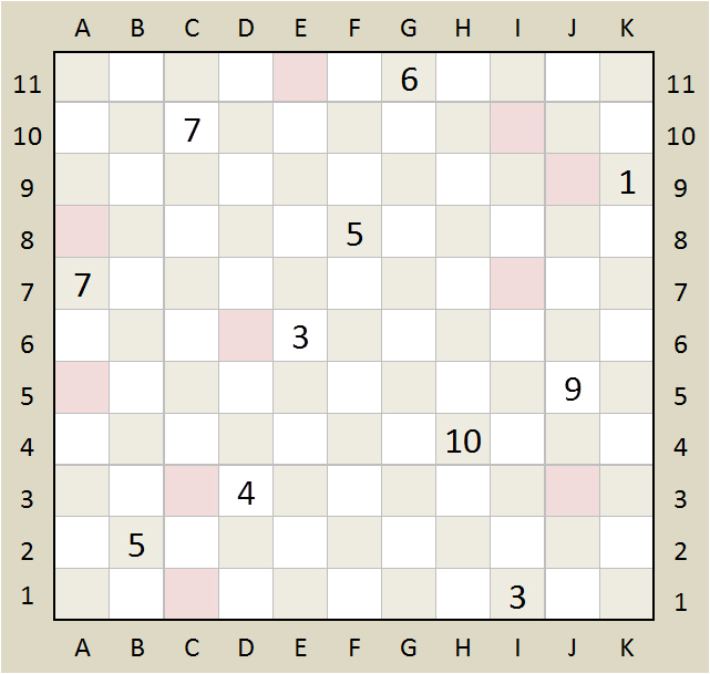 Auch das geht überraschenderweise nicht. Weder auf einem 8 x 8 noch auf einem 9 x 9 noch auf einem 10 x 10 Brett. Allerdings gibt es Lösungen für 5 x 5, 7 x 7 und 11 x 11. Von letzteren suchen wir eine, und zwar diejenige, die zu dieser Stellung paßt und bei der nebenbei einige Gruppen von Zahlen entstehen, die jeweils ein magisches Quadrat im Format 3 x 3 bilden. ("Magisch" heißt, die Zahlen in den Zeilen, Spalten und Hauptdiagonalen addieren sich jeweils zu ein und derselben Summe auf. Dabei spielt es keine Rolle, ob es die Zahlen von 1 bis 9, 2 bis 10 oder 3 bis 11 sind; denn nur auf die Gleichheit der Summen kommt es an). Falls Ihr mehr als eine Lösung finden solltet, ist die mit der höchsten Anzahl magischer Quadrate die richtige.