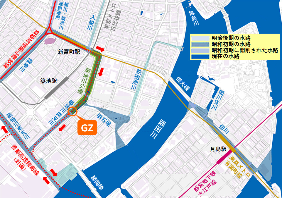 The Chuo City Tsukijigawa Park is an elongated park built along the south tributary of Tsukiji river, which was once flowing. At the north end of the park, there are a multipurpose square with basketball goals, a catch-ball place, and a dog run, which were created by arranging the river bed under the Irifune bridge. On the south side, the park with a day camp site and a playground equipment corner was built in the land which was made by reclaiming of the river. There is a tunnel structure under the park, a remnant of the plan to connect the Shuto Expressway route 10 (Harumi route) with the route C1 (Inner circular route) at Shintomicho.