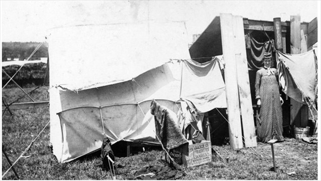 Many women, both white and African American, participated in the Land Run of 1889. They were also lured by promises of inexpensive land and further opportunities. Married women followed their husbands, sometimes unhappily, to what was considered the uncivilized frontier. Single and widowed women also made the race themselves for the same reasons. The Homestead Act stated, in regards to gender, that women must be single or widowed, at least twenty-one years of age, and the head of household to claim a homestead. Upon arriving and staking a claim, women worked alongside men to build their homes and begin their farms. Along with taking care of any children, they also labored to take care of a household, often within a primal sod home and without the same conveniences of their former lives in the East. The women were forced to be versatile, using what they could find to keep their homes. For example, they gathered cow chips to burn for cooking; chased out intruding mice, snakes, and bugs; and cooked while sometimes having to shield falling dirt and mud from the food. They also served as mediators, politicians, leaders, and teachers until towns could be established.