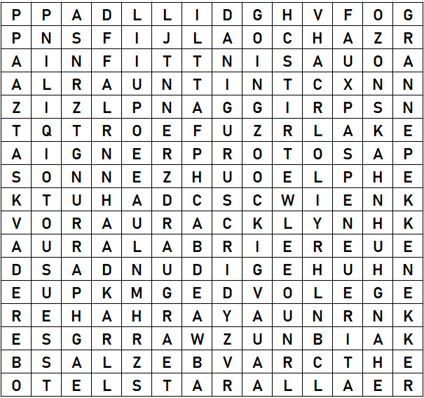 Die 18 Begriffe sind horizontal, vertikal, und diagonal, vorwärts und rückwärts in das Buchstabengitter untergebracht. Die Begriffe haben 1*3, 1*4, 3*5, 3*6, 2*7, 4*8, 2*11, 1*13, 1*14 Buchstaben. Einer der Begriffe besteht aus zwei Wörtern.