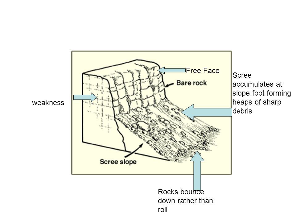 Most cliffs have some form of scree slope at their base. Scree is a collection of broken rock fragments at the base of crags, cliffs, volcanoes or valley shoulders that has accumulated through periodic rockfall from adjacent cliff faces. Landforms associated with these materials are often called talus deposits. Talus deposits typically have a concave upwards form, while the maximum inclination corresponds to the angle of repose of the mean debris size. In arid areas or under high cliffs, they are generally exposed jumbles of fallen rock. In areas of higher moisture, a soil slope may obscure the talus. Many cliffs also feature tributary waterfalls or rock shelters. Sometimes a cliff peters out at the end of a ridge, with tea tables or other types of rock columns remaining.
