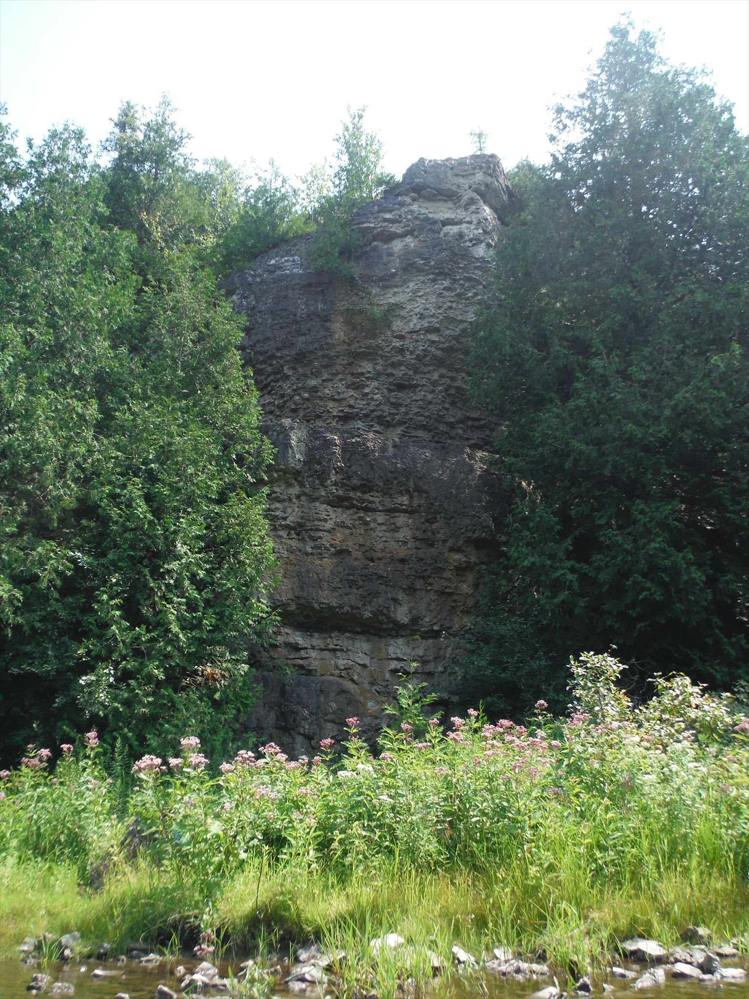 This Earthcache is only accessible by a there and back kayak paddle along the seldom travelled Eramosa River from the town of Rockwood. Access from the community of Everton is no longer available, unless you decide to walk in from the Everton Tract and then walk in the river up stream. Note that if you do decide to paddle all the way from Rockwood, that the river becomes unpredictable, ranging from having to potentially walk your kayak in the summer months, to class I and II rapids in the early Spring. You should not need climbing gear to get up onto the ledge as mother nature has provide an approach on the sides of the cliff. If you pay attention to other cliffs upstream, you may notice people taking part in rock climbing those cliffs.