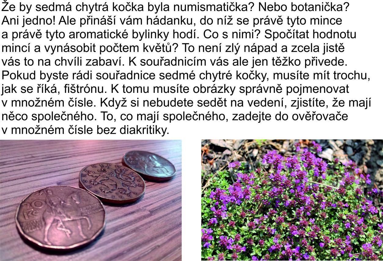 Sedmá kočka je tu. Bude pohodová, nebo dokáže potrápit? Myslím, že jak koho, mohu jen poradit - čtěte pečlivě text v šifře, to slůvko co hledáte, znáte již od prvního stupně základní školy.