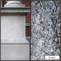 The building stone quarried from the Salem Formation consists of light-grey to bluish-grey limestone (calcarenite) that has oxidized locally to a light tan. It is medium to coarse grained, well sorted, and porous. It consists mostly of small fossils and fossil fragments.