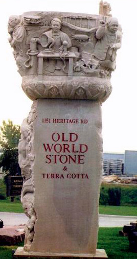 Erected on the front lawn at Old World Stone in 2000, to commemorate the Millennium, this 40 ton limestone monument depicts humankind’s most significant achievements and outstanding humanitarian figures of the 20th century. The images include the flight at Kitty Hawk, the Model T Ford assembly line, the first landing on the moon, and the Canada Arm. The figures of Winston Churchill, Martin Luther King, Mother Theresa, and Mahatma Gandhi grace the four corners.
