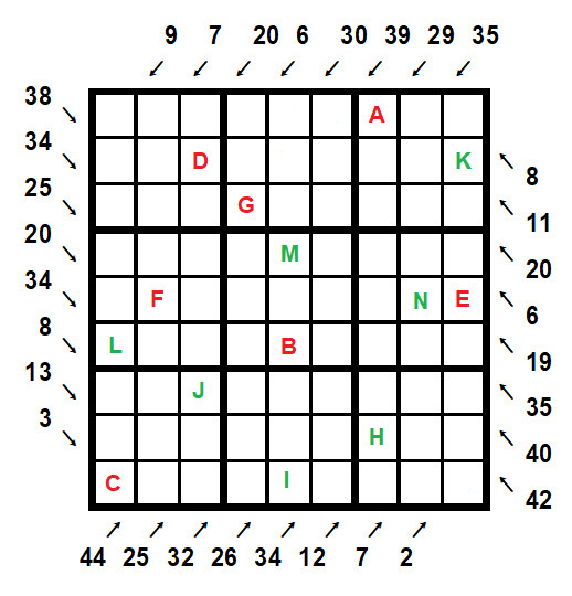 grid indicate the sum of the numbers in the corresponding direction.