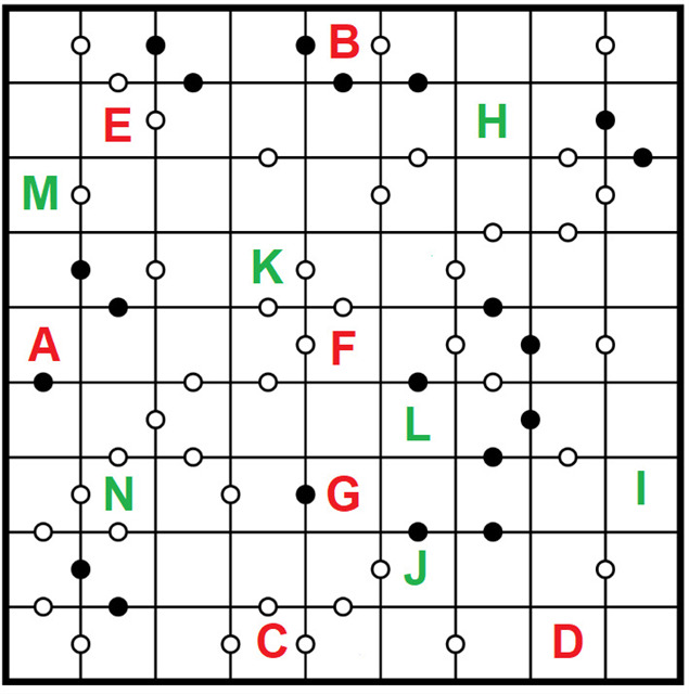 Cells seperated by a white dot must contain digits whose