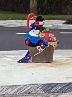 Of course every movement has its detractors, and Mr Gnome finally got bashed with a purloined shopping trolley and expired from his injuries. RIP! There was discussion in community social media as to whether a memorial plaque would be appropriate. So far undecided. BUT a pink toy version of the murder weapon appeared, possibly as a commentary on man's inhumanity to gnome.