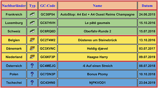 Um dies zu einer echten Herausforderung zu machen, muss man 3 verschiedene Cachetypen jeweils 3 Mal verwenden. Jedes Nachbarland darf nur einmal erscheinen.