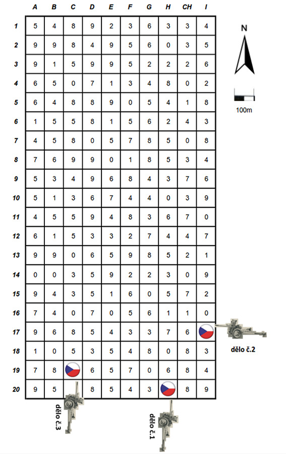 A už je to tady. Na planině před postavením našich děl se začínají objevovat šedivé krabice. Poskakují po terénních nerovnostech, ale stále míří vpřed. První výstřel A vyjde z děla č.3. Střela protne vzduch a po 2,1 sekundách najde svůj cíl. Odměr děla je v té době nastaven na 11° vpravo. A pak už se ozývají výstřely jeden za druhým. (Dělo; čas; odměr; vlevo nebo vpravo)