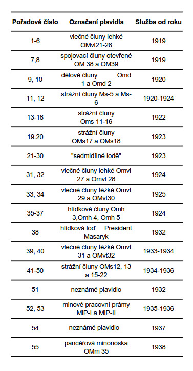 První nová plavidla obdrželo vojenské loďstvo od Ústecké loděnice díky tomu, že v ní zůstaly rozpracovány dřevěné čluny pro rakousko-uherské námořnictvo a počátkem dvacátých let byla jedinou větší loděnicí u nás. Od roku 1923 dodávala plavidla armádě také loděnice v Komárně, kterou si od státu pronajala Škoda Plzeň. Téměř nulové zkušenosti se stavbou lodí, ale způsobovaly opožděné dodávky a určité technické nedostatky.