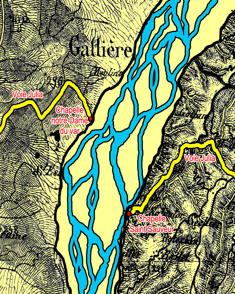 Le fleuve devait être passé à gué. La voie Julia le traversait au gué de Gattieres, qu'on disait être praticable toute l’année, entre la chapelle Saint Sauveur sur la rive est et la chapelle de notre dame du var sur la rive ouest, séparée entre elle d’environ 1,1Km