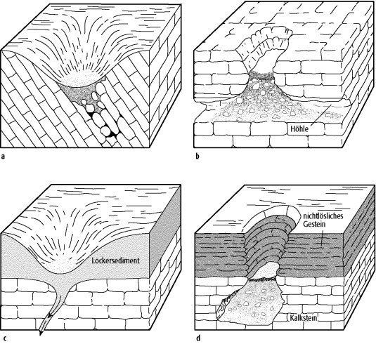 Bei Sackungsdolinen (Erdfälle) sacken nicht verkarstungsfähige Deckschichten allmählich in die durch Lösung entstandenen Hohlräume im Liegenden nach (Abb. 2d).