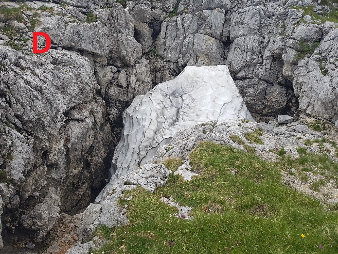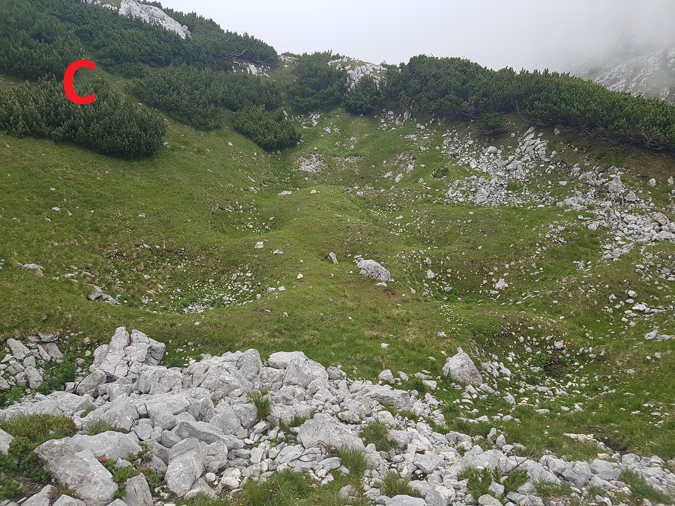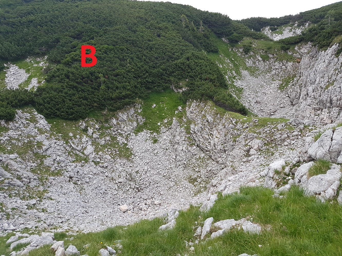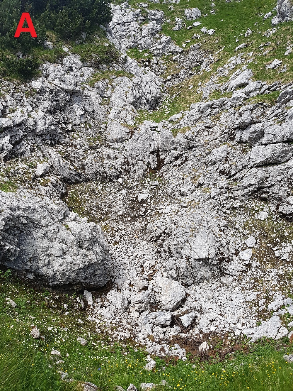 2.Halte die Augen auf dem Weg zwischen dem Startpunkt und dem Berchtesgadener Hochthron offen und finde die 4 Dolinen A bis D. Ordne sie gemäß ihrer Genese und Form den oben genannten Kategorien zu.