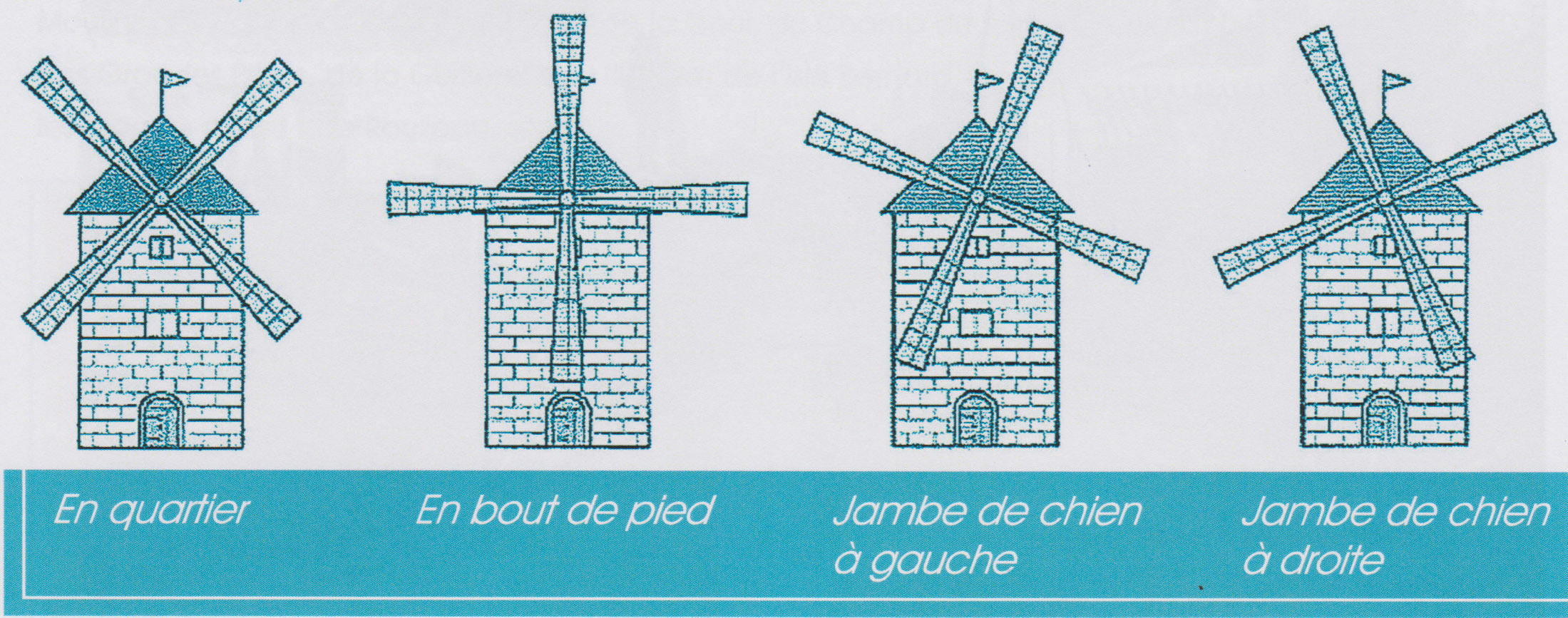 - les ailes arrêtées en croix de Saint André (en quartier) signalaient un événement heureux chez le meunier ou le retour au calme dans un conflit militaire