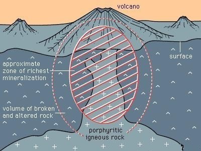 Porphyry deposits are formed when a column of rising magma is cooled in two stages. In the first, the magma is cooled slowly deep in the crust, creating the large crystal grains with a diameter of 2 mm or more. In the second and final stage, the magma is cooled rapidly at relatively shallow depth or as it erupts from a volcano, creating small grains that are usually invisible to the unaided eye.