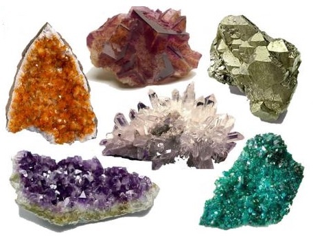 Minerals, naturally occurring elements and chemical compounds having characteristic physical properties such, crystal shape, color, line color, gloss, hardness, cleavage, fracture, density and optical conditions.