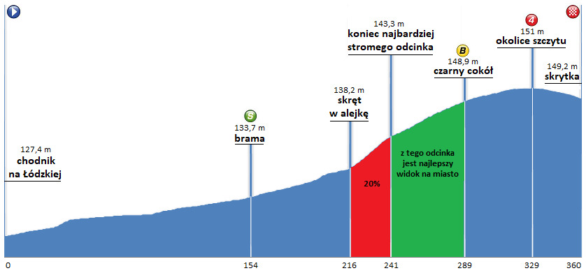 Zdobywając szczyt można choć przez moment poczuć się jak podczas górskiej wspinaczki. Zgodnie z wykonanym przeze mnie profilem trasy, na najtrudniejszym odcinku (zaznaczonym na profilu na czerwono) wchodzimy 5 metrów do góry pokonując 25 metrów w poziomie – nachylenie ścieżki wynosi 20%. Średnie nachylenie od początku trawiastej alejki do szczytu wynosi 11%, natomiast od ulicy Łódzkiej do szczytu 7%
