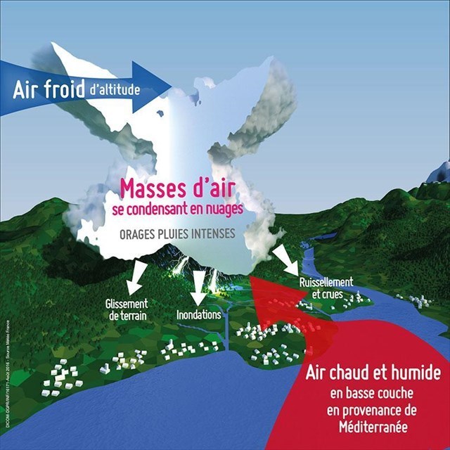 Chaque année, les 15 départements de l’arc méditerranéen connaissent des épisodes de pluies intenses (également appelés épisodes cévenols) pouvant conduire à des crues soudaines sur des territoires à forte concentration touristique : l’équivalent de plusieurs mois de précipitations tombe alors en seulement quelques heures. Les épisodes de pluies méditerranéennes se produisent principalement durant la période de septembre à mi-décembre.