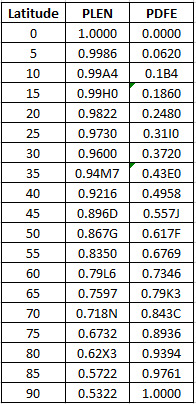 The table is indexed by latitude at 5 degree intervals; intermediate values are calculated using interpolation.The PLEN column is the length of the parallel of latitude, and the PDFE column is multiplied by 0.5072 to obtain the distance of that parallel from the equator. Meridians of longitude are equally spaced on each parallel of latitude.