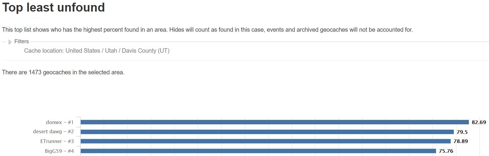 As of August 27, 2018, BigG59 has found 75.76% of all currently-active Davis County, Utah geocaches. That is 1,115 of 1,473 total caches. He has the 4th highest "Found it" percentage of anyone who has ever found a geocache in Davis County.