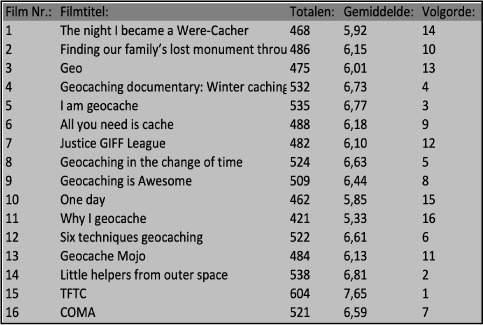 Op de derde plaats staat het filmpje van de "pratende ammobox". Op de tweede plaats is het filmpje gekozen waarbij de cacher hulp kreeg van aliens. En met een overtuigende score is het filmpje "TFTC" als beste verkozen. Dit is het filmpje waarbij de geocacher allerlei verwondingen opliep en zich aan het eind aansloot bij zijn gehavende collega's.