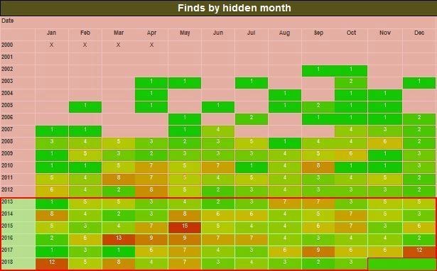 Es muss in der Statistik "Finds per hidden month" ("Versteckmonate") mind. ein Fund aus jedem Monat von Januar 2013 bis heute (aktueller Monat des Loggens dieser Challenge) geloggt sein!