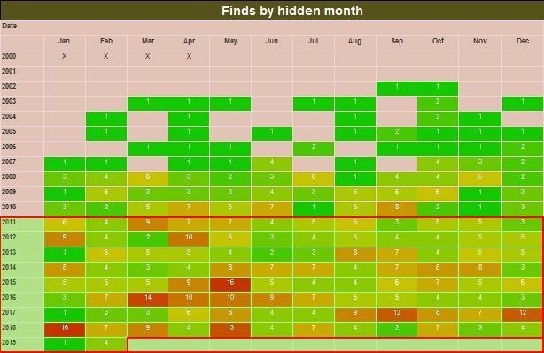 Es muss in der Statistik "Finds per hidden month" ("Versteckmonate") mind. ein Fund aus jedem Monat von Januar 2011 bis heute (aktueller Monat des Loggens dieser Challenge) geloggt sein!
