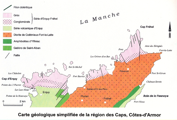 Les roches les plus connues de tous sur le cap est le grès rose. Toutefois c’est le massif de diorite qui compose la majeure partie du soubassement du cap Fréhel. On peut aussi apercevoir des filons de dolérite dans le grès tout au long de la côte entre le cap Fréhel et le cap d’Erquy : à l’ouest de la pointe du Jas, à Pory, à la plage de la Fosse, à Pléhérel-plage, dans les carrières de Fréhel...