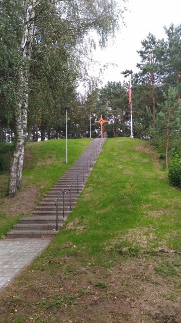 EN: In Moletai, near Lake Pastovėlis, there is a place named Spring Mountain. Here during the interwar years, the meetings of the organizations of the Union of Lithuanian Catholic Youth "Spring" took place. A cross was built at the top of the hill, to which the participants gave an oath to be honest and honorable children of their nation. This mountain has become sacred, like a mound.
