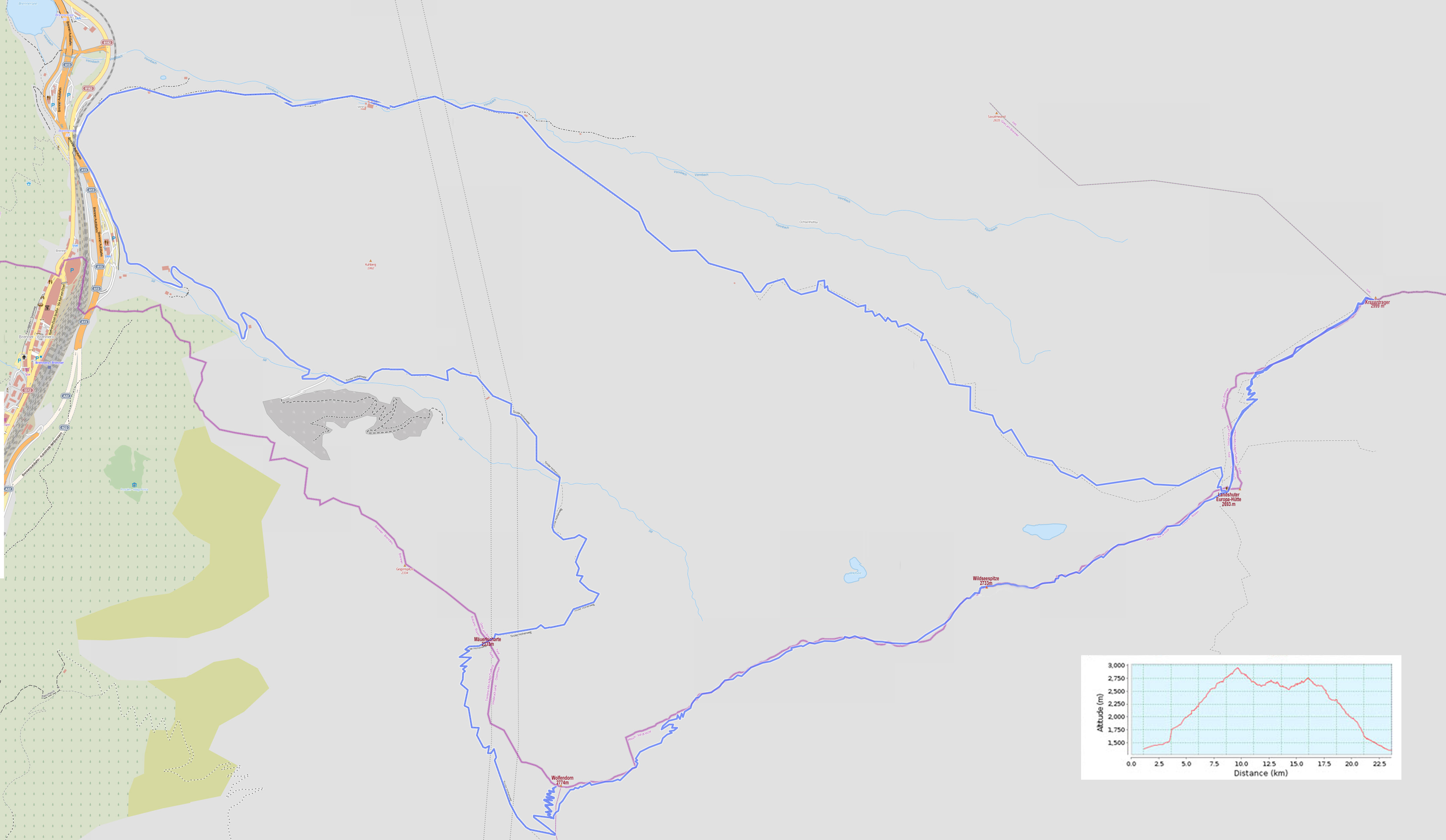 Wir wählten folgende Route: Parkplatz am Ausgang des Venntals in der Nähe der A13, Aufstieg durchs Venntal zur Landshuter Europahütte (2693 m), weiter auf den Kraxentrager (3000m), zurück über die Europahütte zur Wildseespitze (2733 m) und anschließend zum Wolfendorn (2774 m). Abwärts ging es dann über die Mäuerlscharte (2333 m), entlang des Tiroler Höhenweges (Quellgebiet der Sill), vorbei an der Griesbergalm und einem Granitgneis-Steinbruch über dessen Zubringerstraße zurück zum Parkplatz. Alles in allem ca. 24 km mit 2000 Hm.